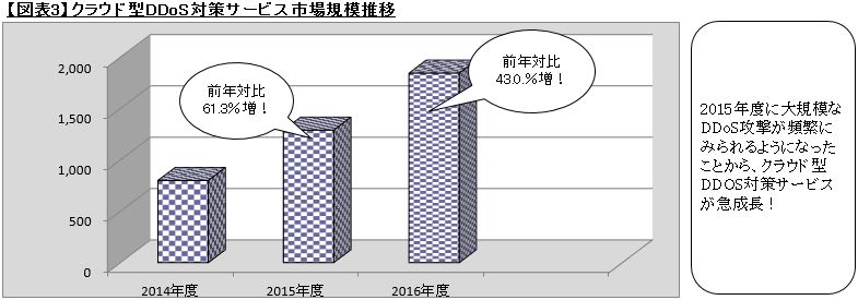 ■今年度は新たに標的型攻撃対策運用サービス、SIEM運用サービス、クラウド型DDoS対策サービスの3つを追加した。標的型攻撃やDDoS攻撃の増加など、サイバー攻撃も多様化しており、それに伴って各社の提供サービスも拡大している。この傾向は2016年度以降も続くと考えられ注目すべき市場である。