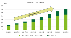 自動対話システム市場は、人手不足の対策や顧客体験の向上のために、自動対話システムの利用が増加し、2023年度で前年比30.9%増の182億円となり、成長する領域である。