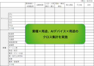 ☑ AIデバイス×用途、業種×用途のクロス集計を実施(2024年度)。業種別の用途動向を明らかに。*AIデバイス:GPU/CPU/SOC/FPGA