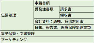 - 伝票処理(申請書類、受発注書類~請求書/領収書、会計資料:通帳/貸借対照表、日報/報告書/医療保険関連書類)