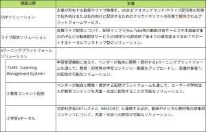 以上、本調査では「OVPソリューション」、「ライブ配信ソリューション」、「eラーニングプラットフォームソリューション」の3分野の観点により、各ベンダーの出荷金額、導入社数、動向などから、市場を明らかにする。
