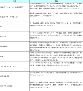 •  ETL/ELTツール、DWH用DB、ソーシャルリスニングツール、CDP、広告効果測定ツール、Webアクセス解析ツール】